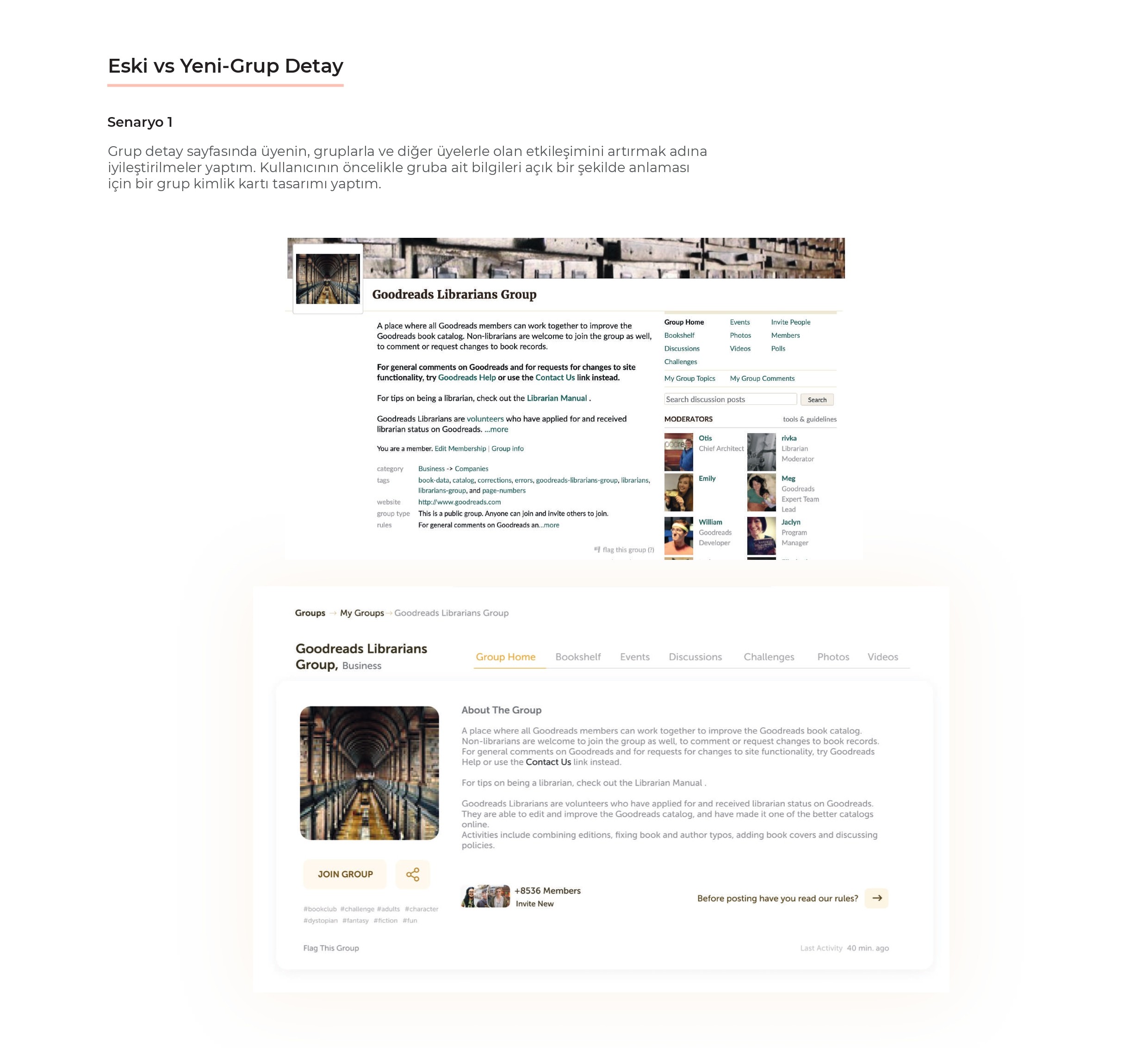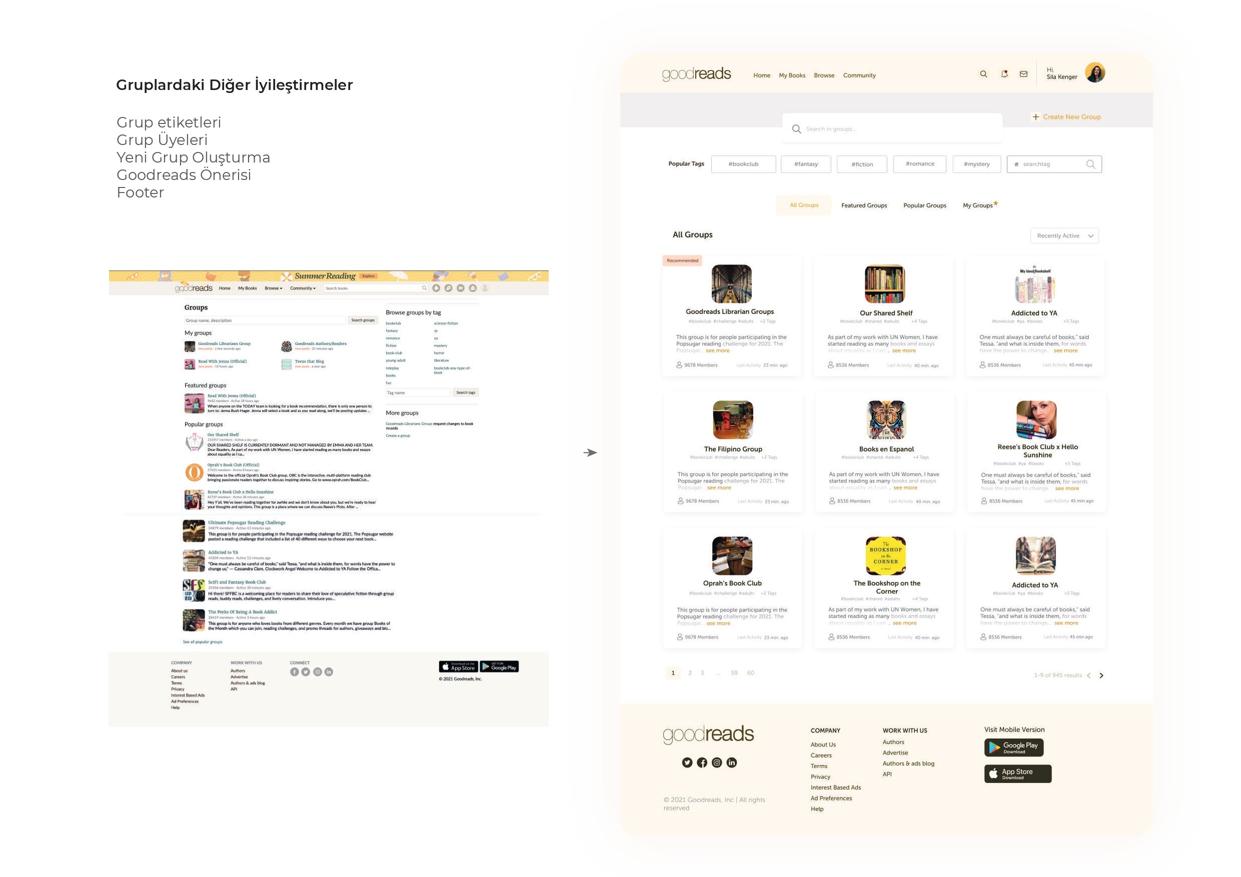 Goodreads' group feature allows you to connect with other people who enjoy reading books on specific topics. to chat about, contact, or organize events. Groups can generally be local groups, specific fan groups (Harry Potter, Lord of the Rings, etc.), or groups formed by famous people. In this case, in order to increase the use of the group feature and to design a more effective. We are waiting for you to redesign it in terms of UI & UX in order to bring it together. When designing, you can design dependent or independent of the existing design.
